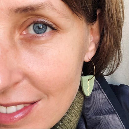 Paire de boucles d'oreilles en argile, vertes et jaunes. Fermoir en laiton. Pièce unique. Peut être porté dans l'eau.
